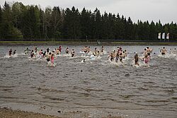 Gegen 14.30 Uhr erfolgte der Startschuss: Dann stürmten über 200 mutige kleine und große Wasserratten in den doch mit 12°C recht kühlen Filzteich. Als Belohnung gab es zahlreiche Preise – der Hauptpreis von 1.000 kWh Silberstrom ging an eine Familie in Lauter-Bernsbach. Ein buntes Unterhaltungsprogramm mit Live-Musik von Kevin Cash and The Cattlemen, dem Tanzprojekt Keen on Rhythm, der mobilen Fussball-Arena sowie mit den Motorrennsportlern rundete diesen Tag ab.