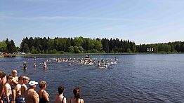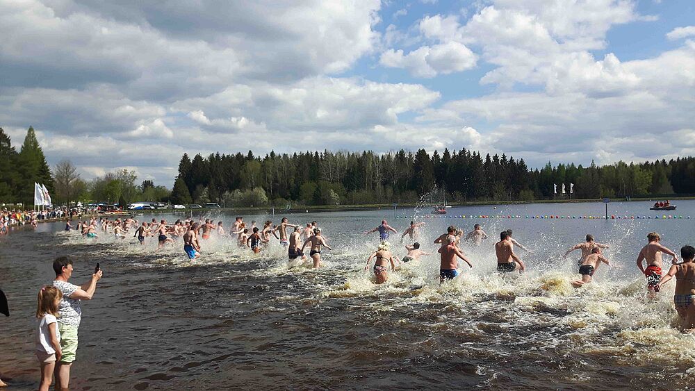 Gegen 14.30 Uhr erfolgte der Startschuss: Dann stürmten über 200 mutige kleine und große Wasserratten in den doch mit 12°C recht kühlen Filzteich. Als Belohnung gab es zahlreiche Preise – der Hauptpreis von 1.000 kWh Silberstrom ging an eine Familie in Lauter-Bernsbach. Ein buntes Unterhaltungsprogramm mit Live-Musik von Kevin Cash and The Cattlemen, dem Tanzprojekt Keen on Rhythm, der mobilen Fussball-Arena sowie mit den Motorrennsportlern rundete diesen Tag ab.